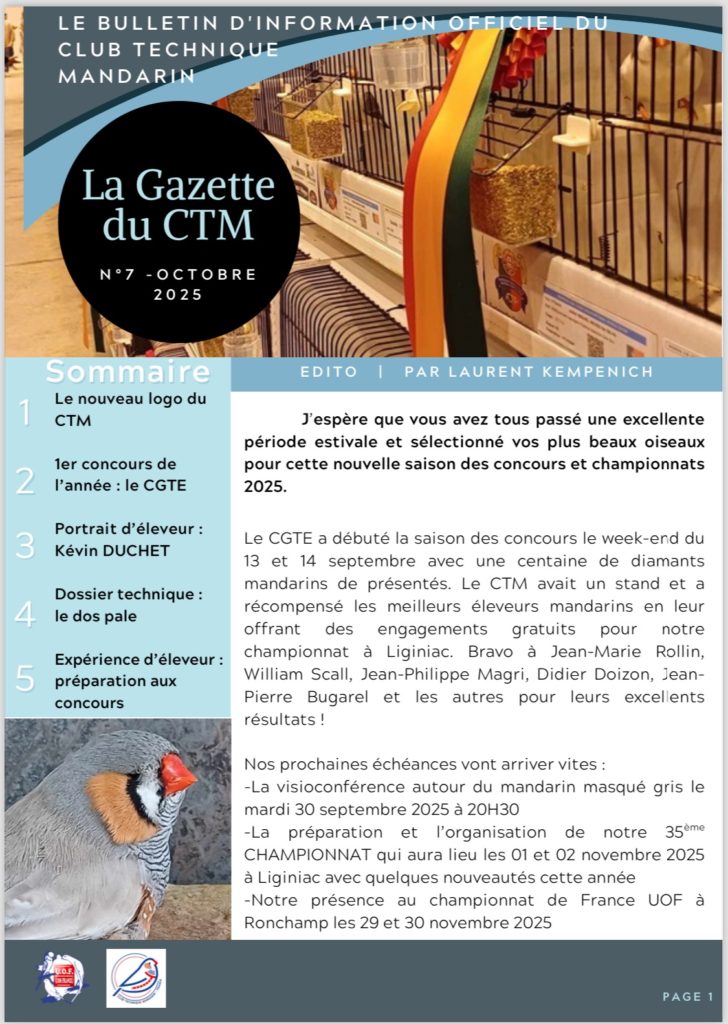 Le CTM est affilié à l’UOF (Union Ornithologique de France). Il est ouvert à tous les éleveurs français et étrangers, de mandarins quelles que soient leurs fédérations.